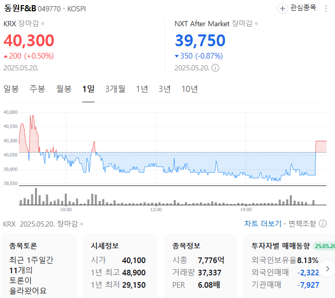 단기 포트폴리오를 구성하려면 시가 총액과 장중 거래량도 확인해야 합니다. 동원F&B의 시가 총액은 7776억 원이며 장중 거래량은 78,526원 을 기록했습니다. 대주주의 정보는 크게 중요하지 않지만 장기적인 관점에서는 확인하는 것이 좋겠습니다.