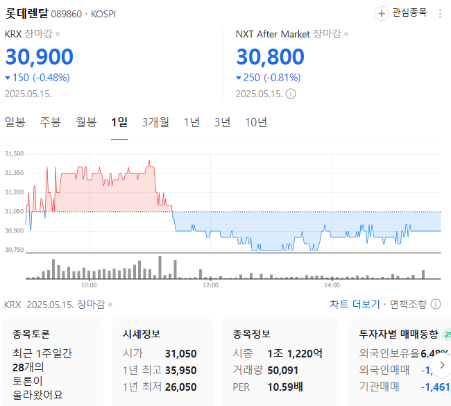 롯데렌탈의 현재 주가는 31,050원입니다. 전일 대비 원 이동한 모습입니다. 시가 총액은 1조1220억 원이며 발행 주식은 총 36,309,388주 입니다. 외국인이 보유한 비중은 6.49%입니다. 롯데렌탈 기업의 영업이익은 억 원을 달성했으며 배당 수익율은 12.12% 입니다.