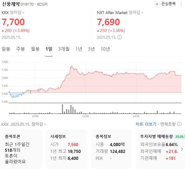 신풍제약의 현재 주가는 7,440원입니다. 전일 대비 -4.00원 이동한 모습입니다. 시가 총액은 4080억 원이며 발행 주식은 총 52,984,990주 입니다. 외국인이 보유한 비중은 6.60%입니다. 신풍제약 기업의 영업이익은 억 원을 달성했으며 배당 수익율은 N/A% 입니다.