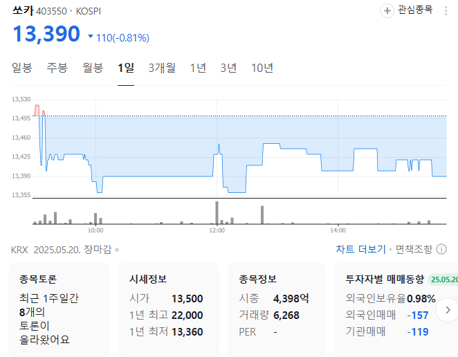 쏘카의 현재 주가는 13,500원입니다. 전일 대비 -200원 이동한 모습입니다. 시가 총액은 4398억 원이며 발행 주식은 총 32,841,902주 입니다. 외국인이 보유한 비중은 0.98%입니다. 쏘카 기업의 영업이익은 억 원을 달성했으며 배당 수익율은 296,472% 입니다.