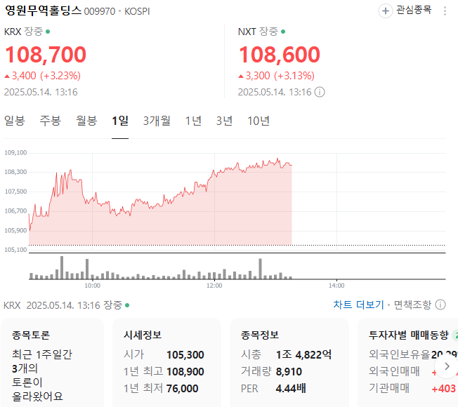 영원무역홀딩스의 현재 주가는 105,300원입니다. 전일 대비 원 이동한 모습입니다. 시가 총액은 1조4822억 원이며 발행 주식은 총 13,635,592주 입니다. 외국인이 보유한 비중은 20.29%입니다. 영원무역홀딩스 기업의 영업이익은 억 원을 달성했으며 배당 수익율은 6.43% 입니다.
