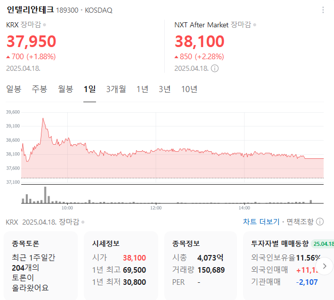 단기 포트폴리오를 구성한다면, 시가 총액과 장중 거래량도 살펴봐야 합니다. 인텔리안테크의 시가 총액은 4073억 원이며 장중 거래량은 491,340원 을 기록했습니다. 대주주의 정보는 중요하지 않을 수 있지만 장기적으로는 확인하는 것이 좋습니다.