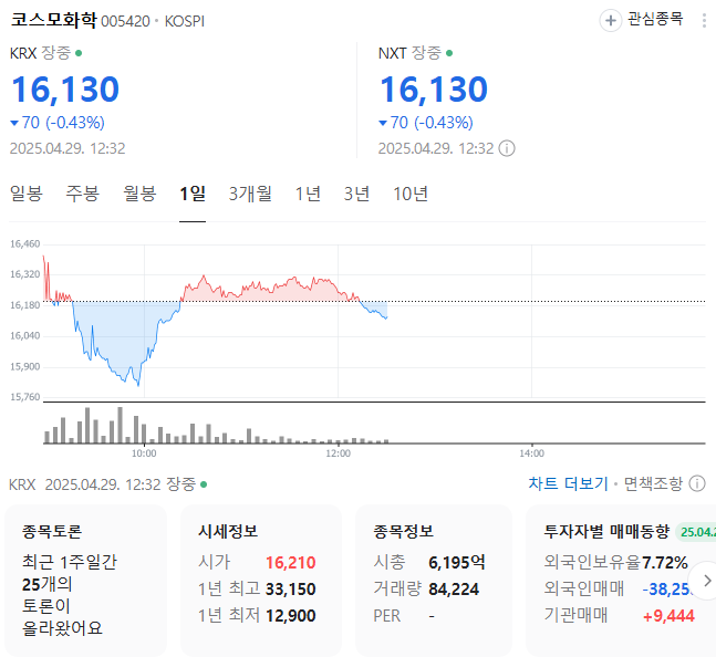 코스모화학의 현재 주가는 16,200원입니다. 전일 대비 -2.70원 이동한 모습입니다. 시가 총액은 6199억 원이며 발행 주식은 총 38,408,228주 입니다. 외국인이 보유한 비중은 7.72%입니다. 코스모화학 기업의 영업이익은 억 원을 달성했으며 배당 수익율은 2.28% 입니다.