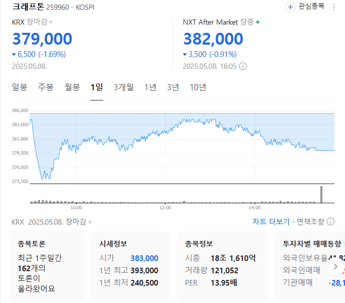 단기 포트폴리오를 구성한다면 시가 총액과 장중 거래량도 살펴봐야 합니다. 크래프톤의 시가 총액은 18조1610억 원이며 장중 거래량은 142,419원 을 기록했습니다. 대주주의 정보는 크게 중요하지 않을 수 있으나 장기적인 관점에서는 확인해보는 것이 좋습니다.