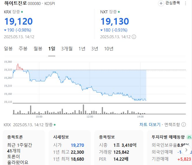 하이트진로의 현재 주가는 19,310원입니다. 전일 대비 -2.96원 이동한 모습입니다. 시가 총액은 1조3410억 원이며 발행 주식은 총 70,133,611주 입니다. 외국인이 보유한 비중은 8.95%입니다. 하이트진로 기업의 영업이익은 억 원을 달성했으며 배당 수익율은 8.40% 입니다.