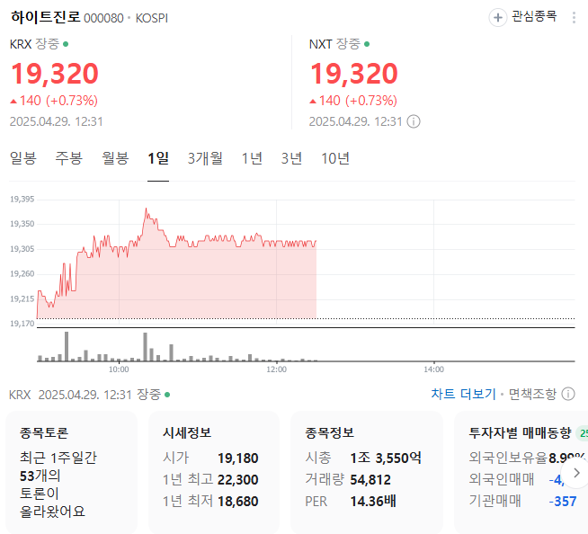 하이트진로의 현재 주가는 19,180원입니다. 전일 대비 -80원 이동한 모습입니다. 시가 총액은 1조3550억 원이며 발행 주식은 총 70,133,611주 입니다. 외국인이 보유한 비중은 8.99%입니다. 하이트진로 기업의 영업이익은 억 원을 달성했으며 배당 수익율은 8.40% 입니다.