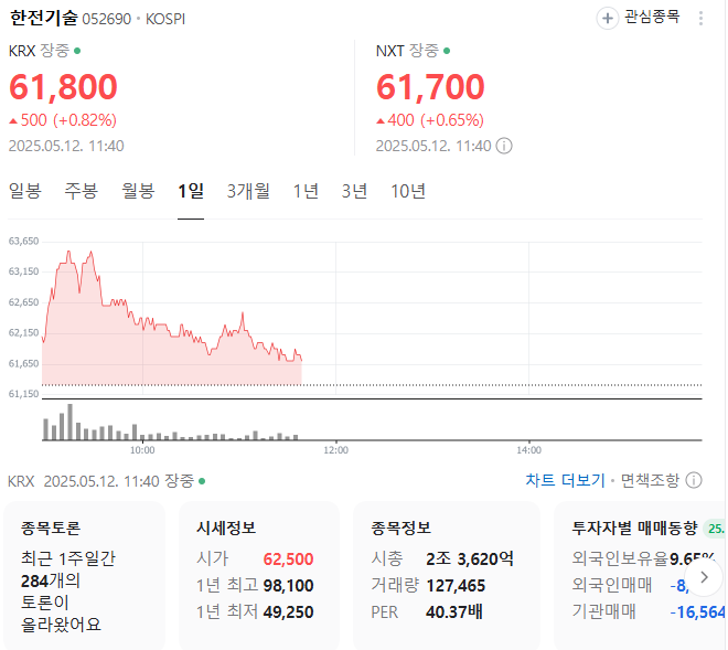 단기 포트폴리오를 구성할 때는 시가 총액과 장중 거래량을 살펴봐야 합니다. 한전기술의 시가 총액은 2조3620억 원이며 장중 거래량은 137,570원 을 기록했습니다. 대주주의 정보는 중요하지 않을 수 있지만 장기적으로는 확인해보는 것이 좋겠습니다.