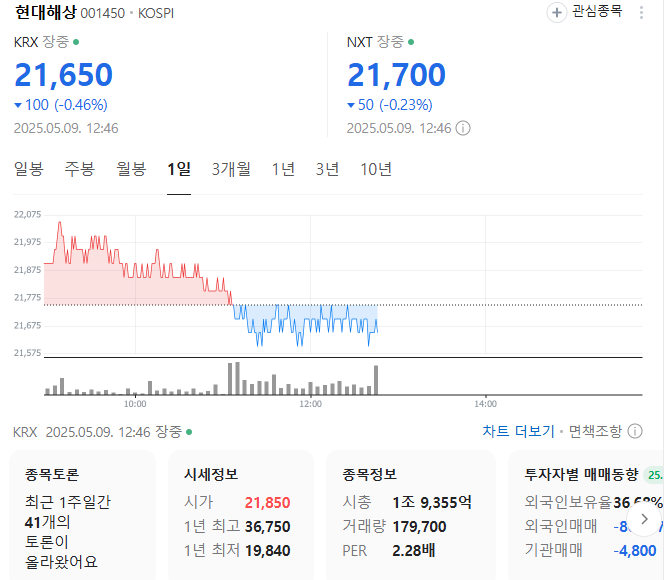 현대해상의 현재 주가는 21,750원입니다. 전일 대비 -200원 이동한 모습입니다. 시가 총액은 1조9400억 원이며 발행 주식은 총 89,400,000주 입니다. 외국인이 보유한 비중은 36.68%입니다. 현대해상 기업의 영업이익은 억 원을 달성했으며 배당 수익율은 9.45% 입니다.