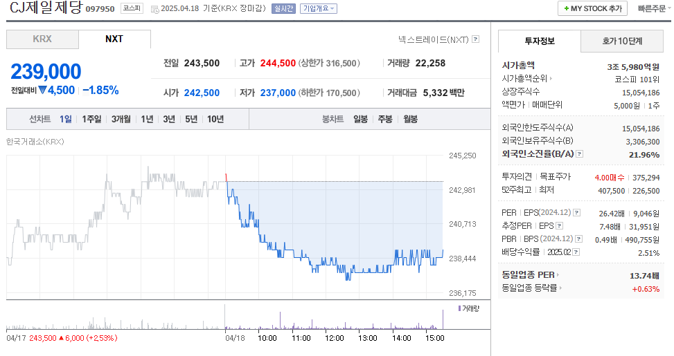 CJ제일제당의 현재 주가는 239,000원입니다. 전일 대비 -4,500원 이동한 모습입니다. 시가 총액은 3조5980억 원이며 발행 주식은 총 15,054,186주 입니다. 외국인이 보유한 비중은 22.01%입니다. CJ제일제당 기업의 영업이익은 억 원을 달성했으며 배당 수익율은 8.40% 입니다.