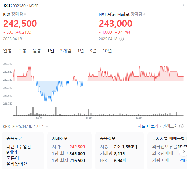 KCC의 현재 주가는 242,500원입니다. 전일 대비 -12.93원 이동한 모습입니다. 시가 총액은 2조1550억 원이며 발행 주식은 총 8,886,471주 입니다. 외국인이 보유한 비중은 10.58%입니다. KCC 기업의 영업이익은 억 원을 달성했으며 배당 수익율은 -0.42% 입니다.
