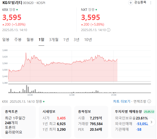 단기 포트폴리오를 구성하려면 시가 총액과 장중 거래량도 확인해야 합니다. KG모빌리티의 시가 총액은 7234억 원이며 장중 거래량은 219,021원 을 기록했습니다. 대주주의 정보는 크게 중요하지 않을 수 있으나 장기적인 관점에서는 확인하는 것이 좋겠습니다.