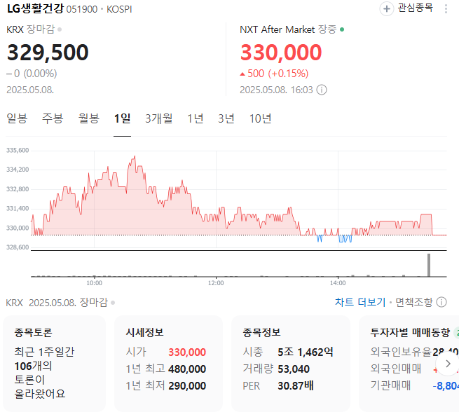 LG생활건강의 현재 주가는 329,500원입니다. 전일 대비 -8,000원 이동한 모습입니다. 시가 총액은 5조1462억 원이며 발행 주식은 총 15,618,197주 입니다. 외국인이 보유한 비중은 28.40%입니다. LG생활건강 기업의 영업이익은 억 원을 달성했으며 배당 수익율은 -0.42% 입니다.